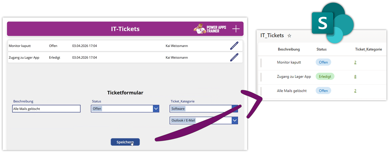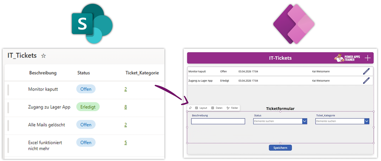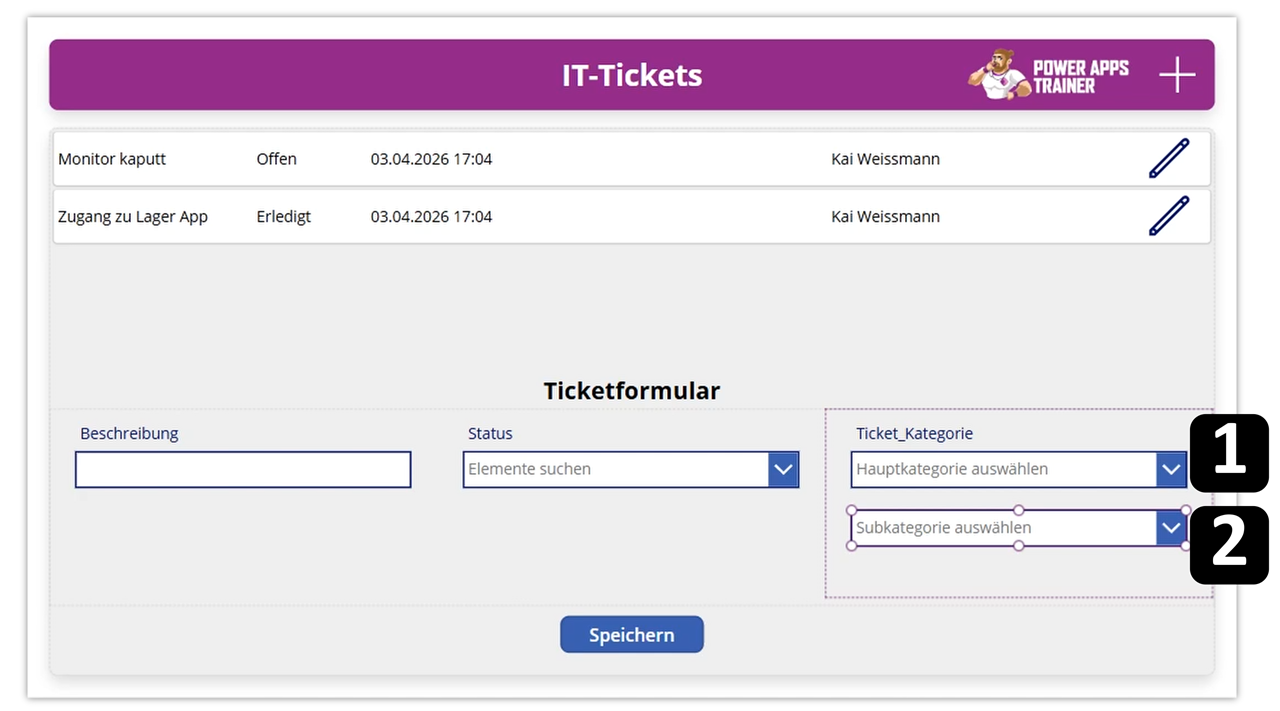 Öffne Power Apps und füge ein Bearbeitungsformular für die Tickets ein.