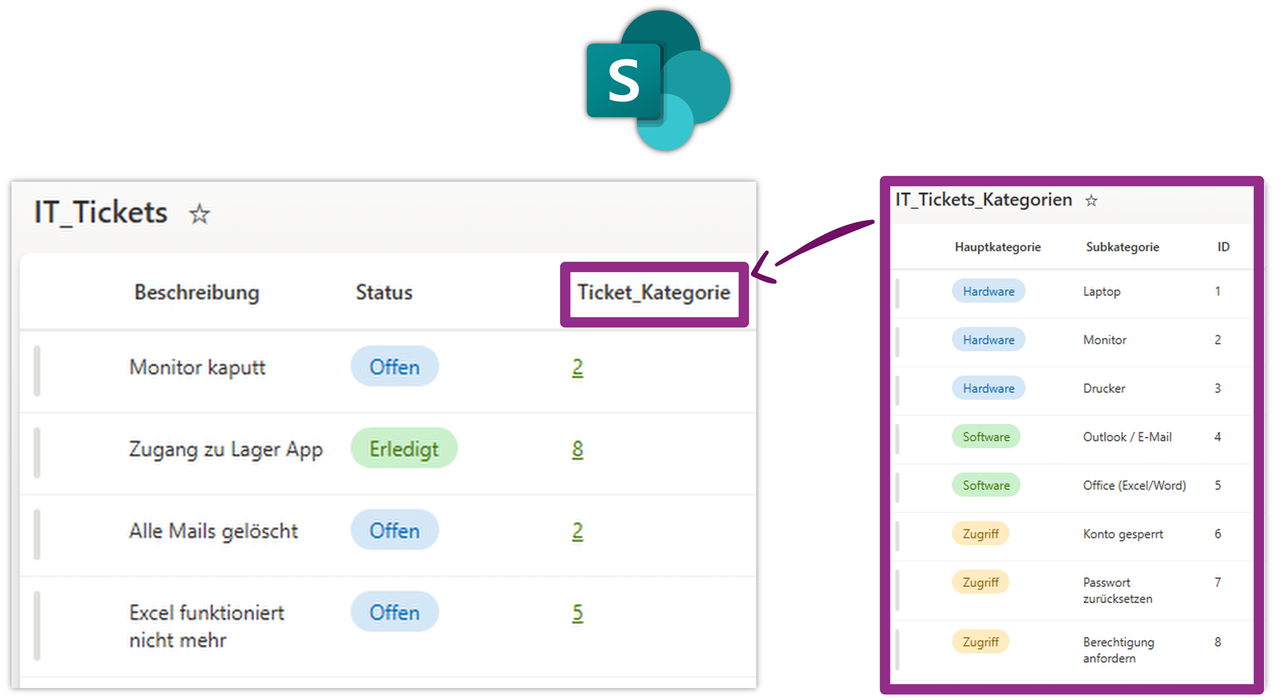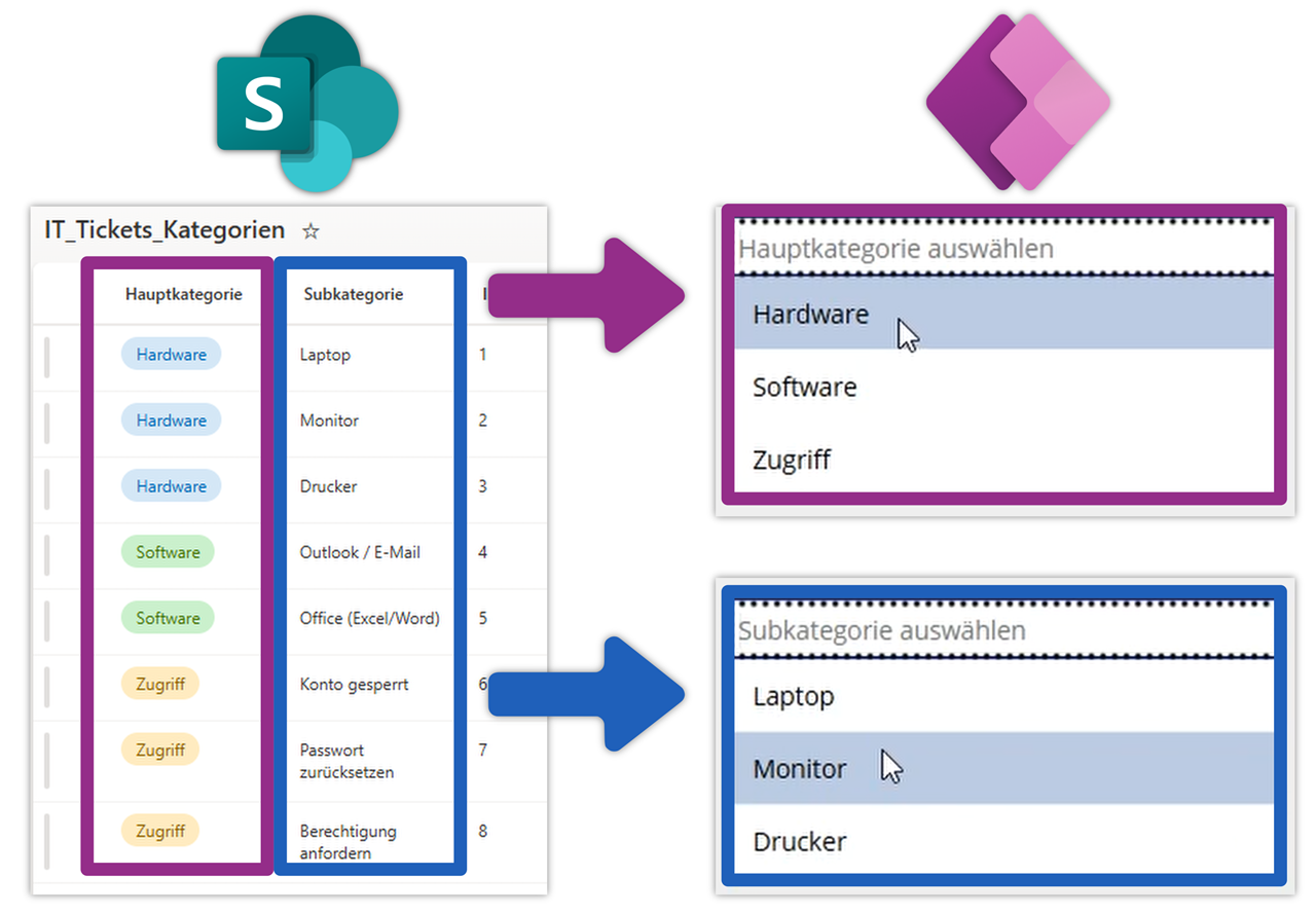 Für diesen Anwendungsfall (Tickets inkl. Zuordnung von Kategorie und Subkategorie) ist es sinnvoll, die Kategorie-Auswahlmöglichkeiten in einer separaten SharePoint Liste abzuspeichern. Aus der Ticket Liste greifen wir dann auf die korrekten Kategorie-Kombination zu.