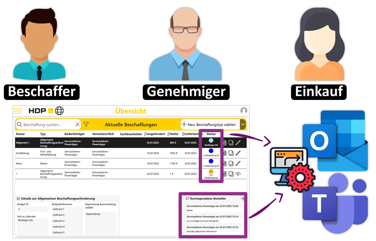 Mithilfe der neuen Beschaffungs-App sind die internen Beschaffungs- und Genehmigungsprozesse nun vollständig digitalisiert und weitgehend automatisiert. Anträge können direkt in der App erfasst, den passenden Budgets zugeordnet und mit den notwendigen Informationen ergänzt werden. Dank klar definierter Workflows werden die Anträge automatisch an die zuständigen Genehmiger und Einkäufer weitergeleitet.