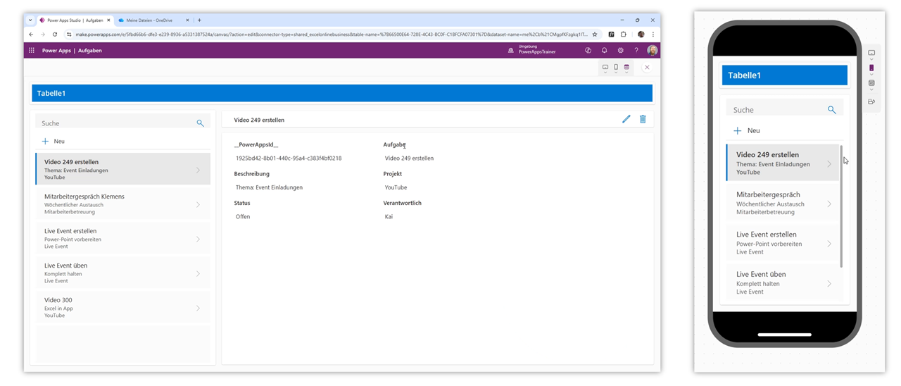 Power Apps erkennt die intelligente Tabelle automatisch. Falls keine eindeutige ID-Spalte vorhanden ist, wird diese von Power Apps selbst erzeugt. Nach wenigen Sekunden wird eine vollständige App erstellt, inklusive Listenansicht, Detailansicht und Bearbeitungsformular.