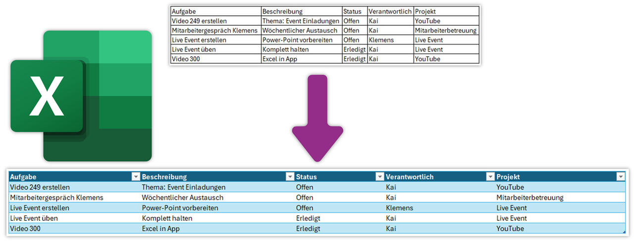 Bevor wir mit Power Apps starten können, muss die Excel-Datei korrekt vorbereitet sein. Power Apps kann nur mit sogenannten intelligenten Tabellen arbeiten. Das bedeutet, dass deine Daten nicht einfach lose in einem Arbeitsblatt stehen dürfen.