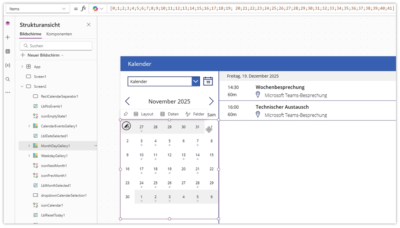 - Sie hat 42 Elemente (Werte 0 bis 41) – damit kann Power Apps bei Bedarf bis zu 6 Wochen anzeigen (6×7=42).