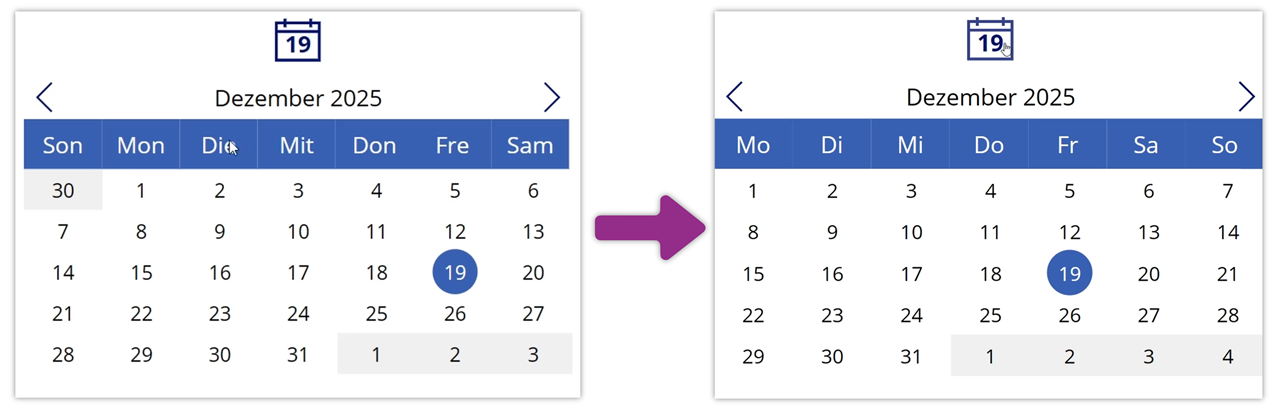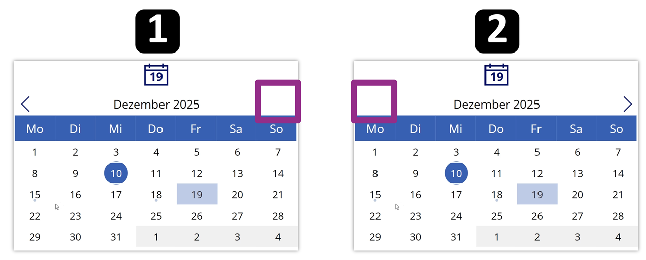 In den Formeln, in denen FirstDayInView mit Weekday() berechnet wird, ergänzt du das optionale Argument StartOfWeek.Monday :